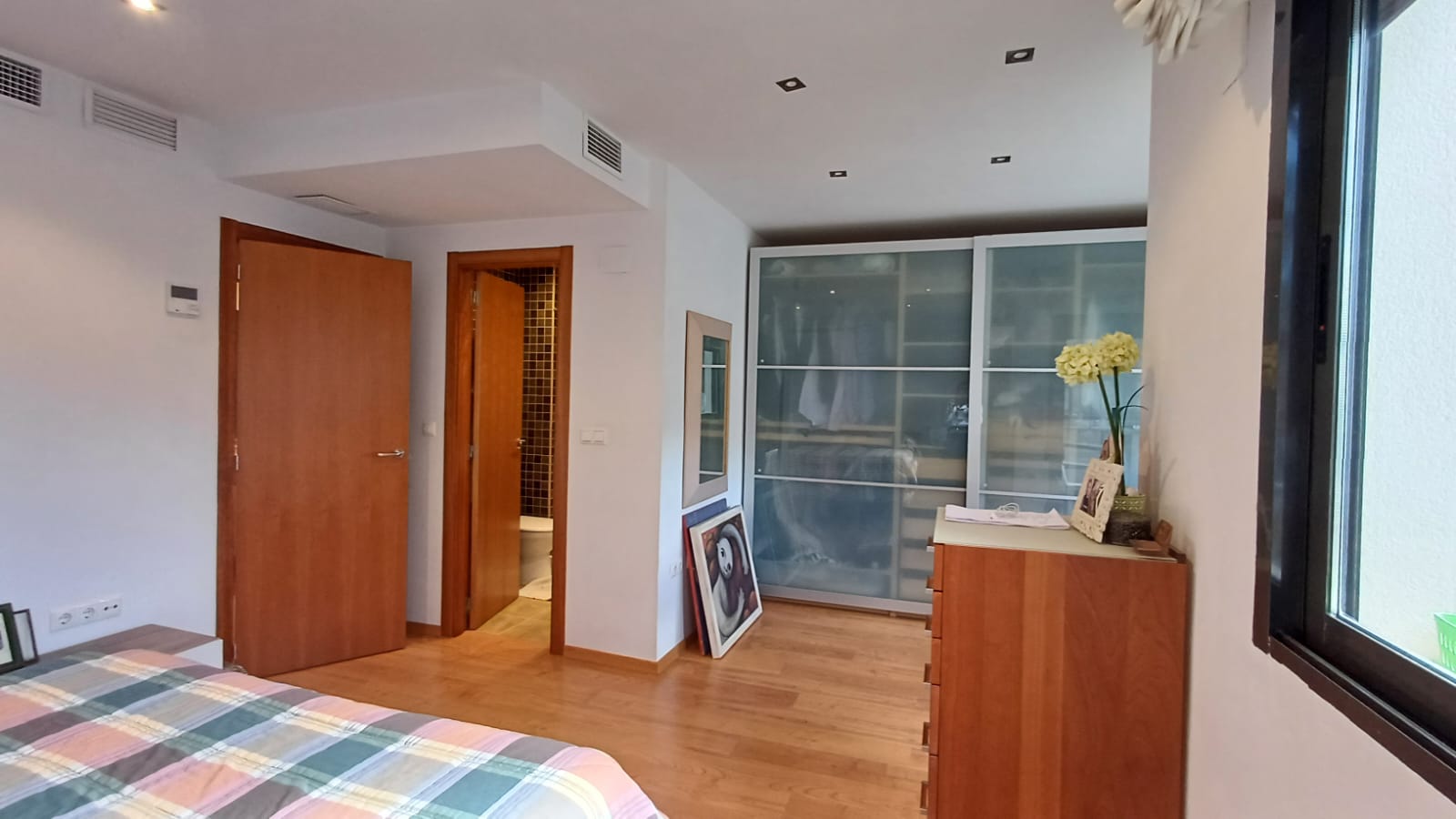 En la primera planta encontramos 3 dormitorios (4 de origen, el cuarto se añadió al dormitorio principal, contando así con zona de vestidor y acceso a terraza- solárium ) y 2 baños completos ( 1 en suite).
